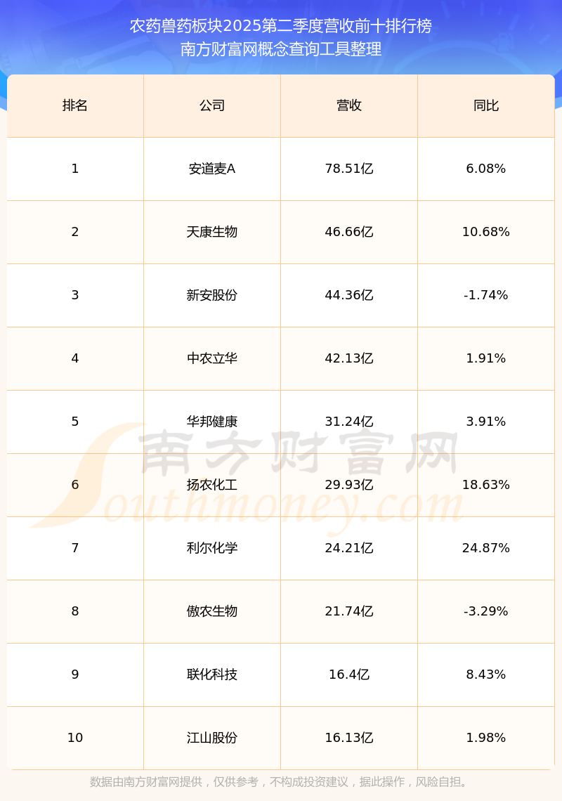 按照南方财富网概念查询工具统计,该股所属板块为农药兽药板块,该板块共有44只股票,百傲化学2025第二季度营收在该板块中排名为第44名,该板块2025第二季度营收排名前十的股票如下表:
