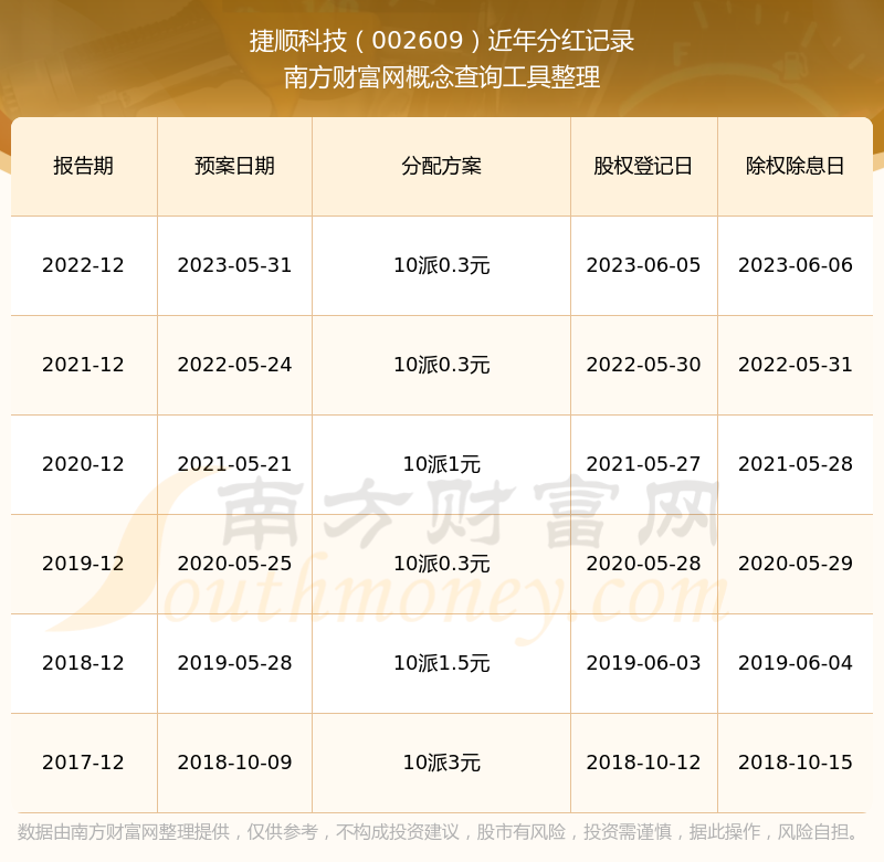 捷顺科技最新一次公布的分红方案为10派0.3元。本次权益分派股权登记日为2023年6月5日,除权除息日为2023年6月6日,派息日为2023年6月6日。