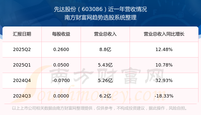 先达股份(603086)发布2025年第二季度财报。2025年第二季度先达股份实现营业收入8.8亿元,同比增加12.48元%,环比增加62.1%;净利润为1.14亿元,同比增长505.87%,环比增长427.11%。
