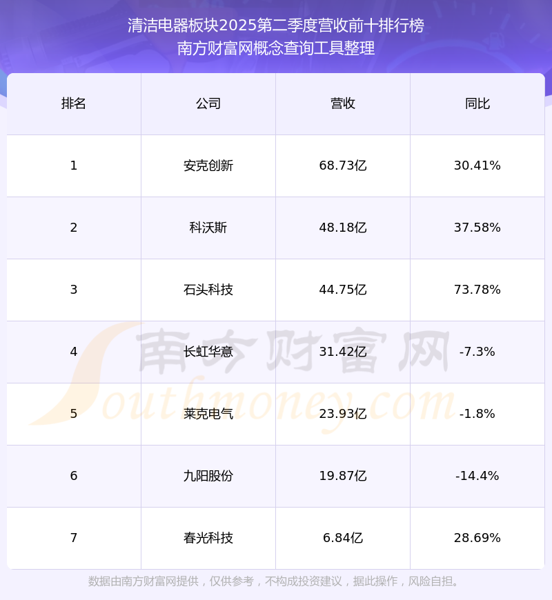 按照南方财富网概念查询工具统计,该股所属板块为清洁电器板块,该板块共有7只股票,莱克电气2025第二季度营收在该板块中排名为第5名,该板块2025第二季度营收排名前十的股票如下表: