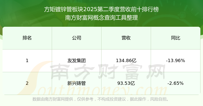 按照南方财富网概念查询工具统计,该股所属板块为方矩镀锌管板块,该板块共有2只股票,友发集团2025第二季度营收在该板块中排名为第1名,该板块2025第二季度营收排名前十的股票如下表: