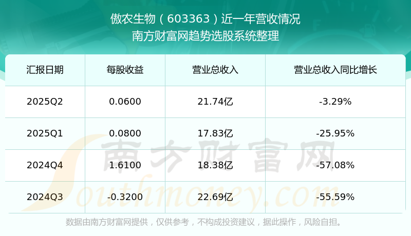 傲农生物(603363)发布2025年第二季度财报。2025年第二季度傲农生物实现营业收入21.74亿元,同比增加-3.29元%,环比增加21.91%;净利润为1.42亿元,同比增长157.46%,环比增长-34.73%。