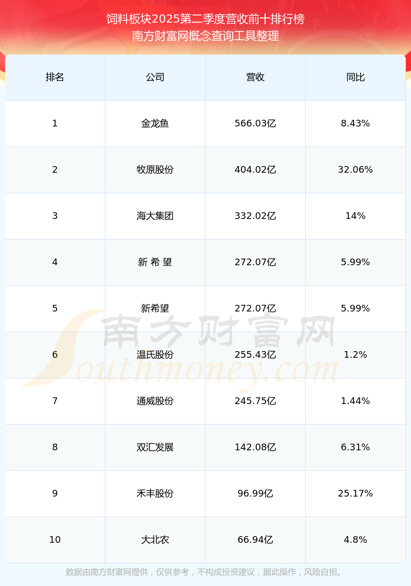 按照南方财富网概念查询工具统计,该股所属板块为饲料板块,该板块共有70只股票,傲农生物2025第二季度营收在该板块中排名为第24名,该板块2025第二季度营收排名前十的股票如下表: