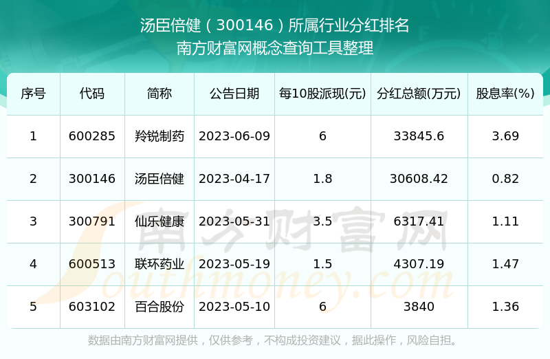 按照南方财富网趋势选股系统统计,汤臣倍健所属行业为片剂行业,片剂行业分红排名情况如下表: