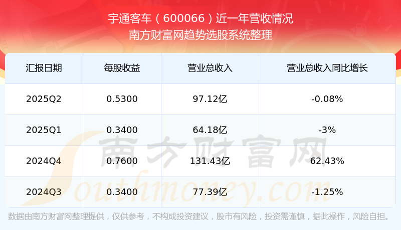宇通客车2025年第二季度报告显示,公司实现主营业务收入97.12亿元,较去年同期增长-0.08%;归属于母公司股东的净利润为11.81亿元,同比增长16.11%;扣除非经常性损益后的净利润为9.08亿元,同比增长5.42%。
