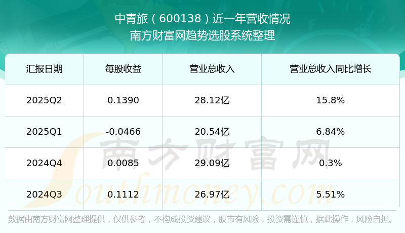 中青旅披露了2025年第二季度财报。报告显示,中青旅2025年第二季度实现营收28.12亿元,同比15.8%;归母净利润1.01亿元,同比-1%。