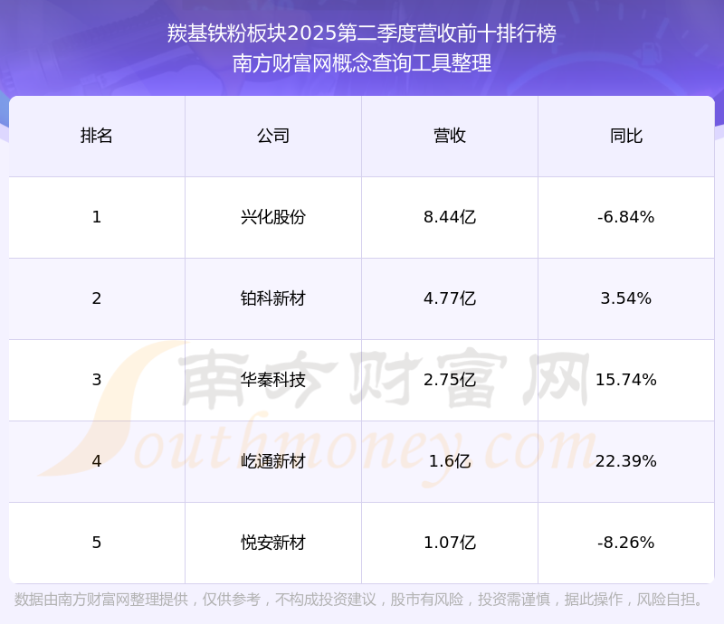 按照南方财富网概念查询工具统计,该股所属板块为羰基铁粉板块,该板块共有5只股票,悦安新材2025第二季度营收在该板块中排名为第5名,该板块2025第二季度营收排名前十的股票如下表: