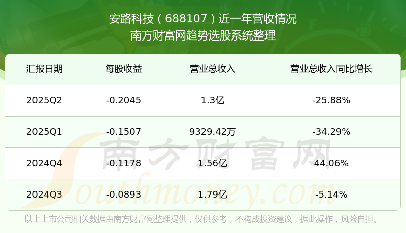 在2025年第二季度,安路科技的业绩表现,主营业务收入达到1.3亿元,实现了-25.88%的同比增长率。同时,公司归母净利润录得-8199.43万元,同比增长-23.31%。