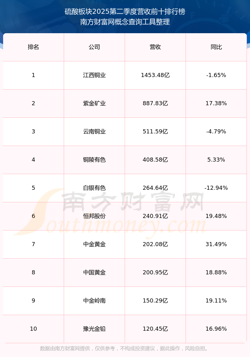 按照南方财富网概念查询工具统计,该股所属板块为硫酸板块,该板块共有86只股票,驰宏锌锗2025第二季度营收在该板块中排名为第22名,该板块2025第二季度营收排名前十的股票如下表: