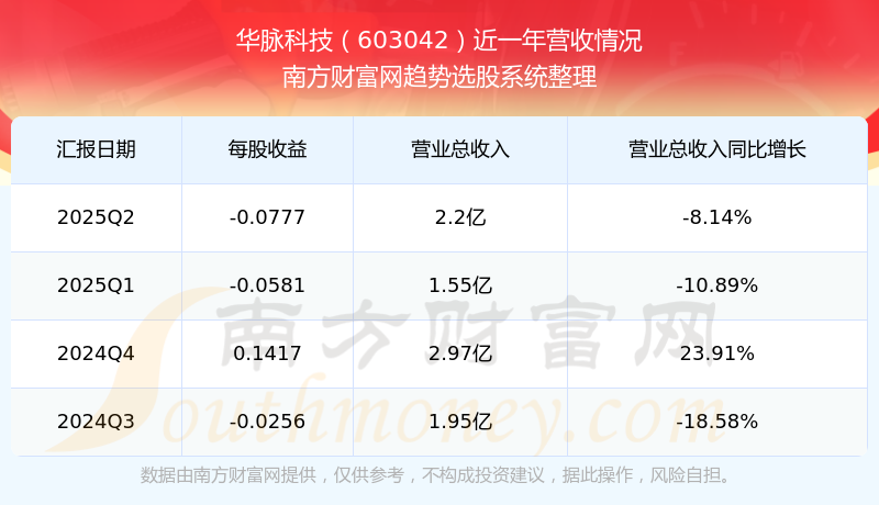按照南方财富网概念查询工具统计,该股所属板块为光无源器件板块,该板块共有11只股票,华脉科技2025第二季度营收在该板块中排名为第10名,该板块2025第二季度营收排名前十的股票如下表: