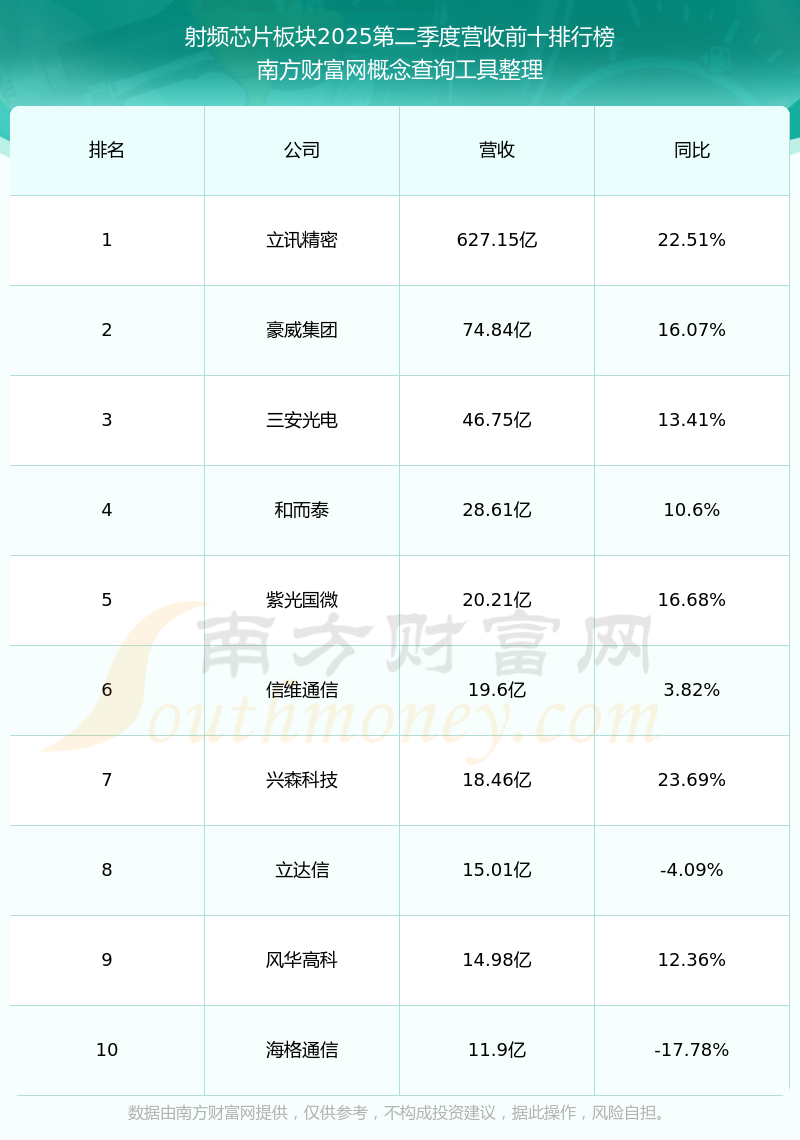 按照南方财富网概念查询工具统计,该股所属板块为射频芯片板块,该板块共有58只股票,国博电子2025第二季度营收在该板块中排名为第24名,该板块2025第二季度营收排名前十的股票如下表:
