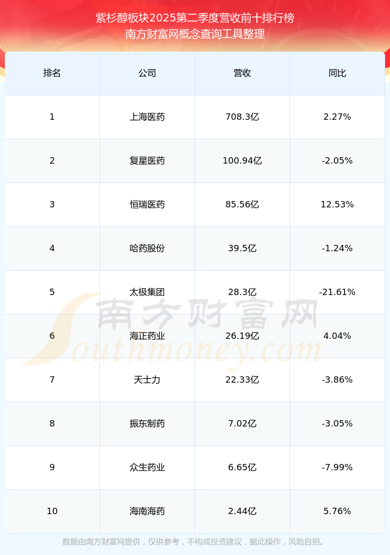 按照南方财富网概念查询工具统计,该股所属板块为紫杉醇板块,该板块共有18只股票,上海谊众2025第二季度营收在该板块中排名为第16名,该板块2025第二季度营收排名前十的股票如下表: