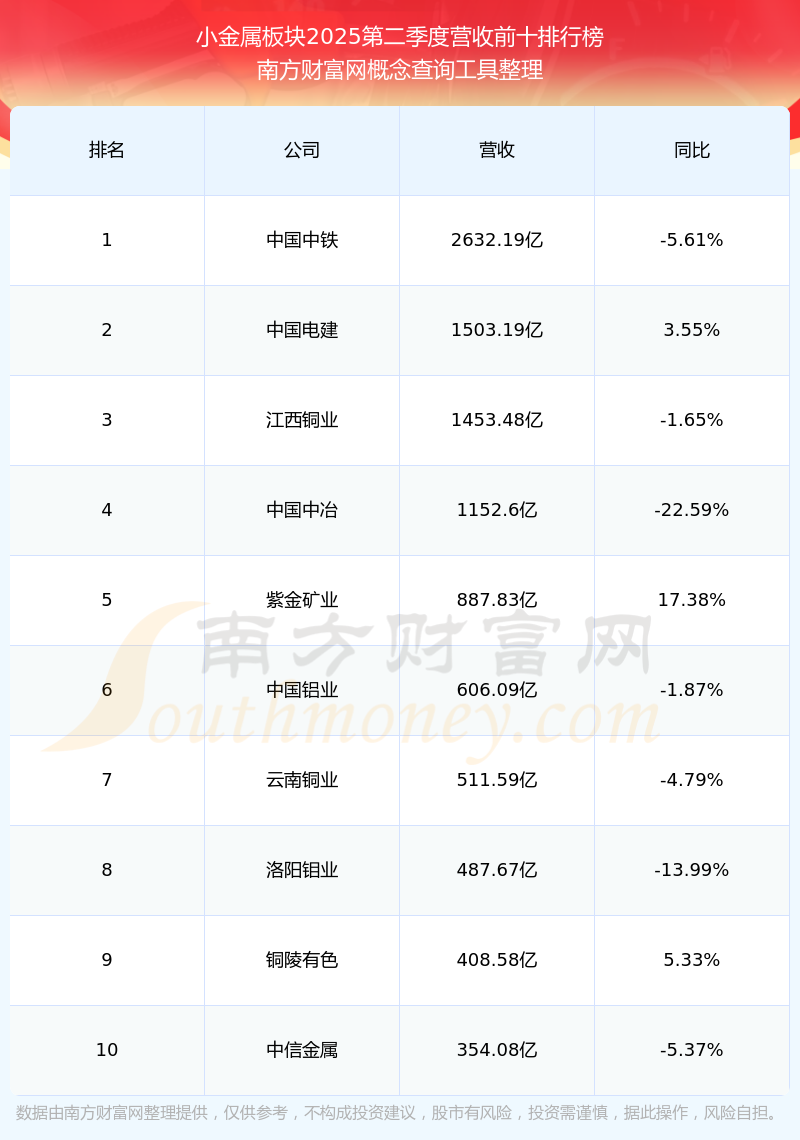 按照南方财富网概念查询工具统计,该股所属板块为小金属板块,该板块共有173只股票,贵研铂业2025第二季度营收在该板块中排名为第20名,该板块2025第二季度营收排名前十的股票如下表: