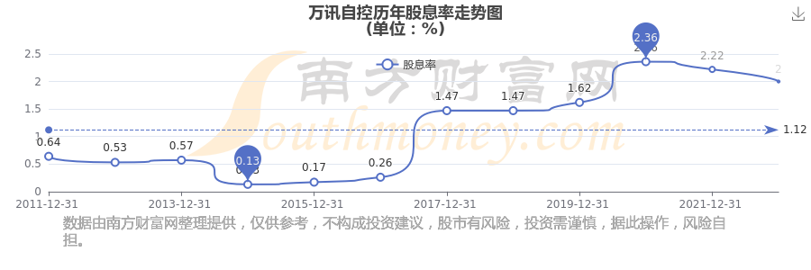 万讯自控最新一次公布的分红方案为10派2元。本次权益分派股权登记日为2023年6月12日,除权除息日为2023年6月13日,派息日为2023年6月13日。