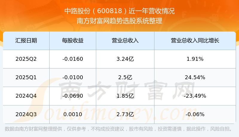 中路股份(600818)披露2025年第二季度报告,报告期实现营收3.24亿元,同比1.91%;归母净利润-507.61万元,同比-162.24%;扣非净利润-495.36万元,同比-150.02%。
