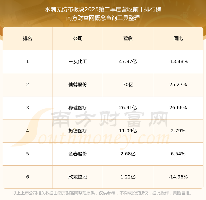 按照南方财富网概念查询工具统计,该股所属板块为水刺无纺布板块,该板块共有6只股票,诺邦股份2025第二季度营收在该板块中排名为第6名,该板块2025第二季度营收排名前十的股票如下表:
