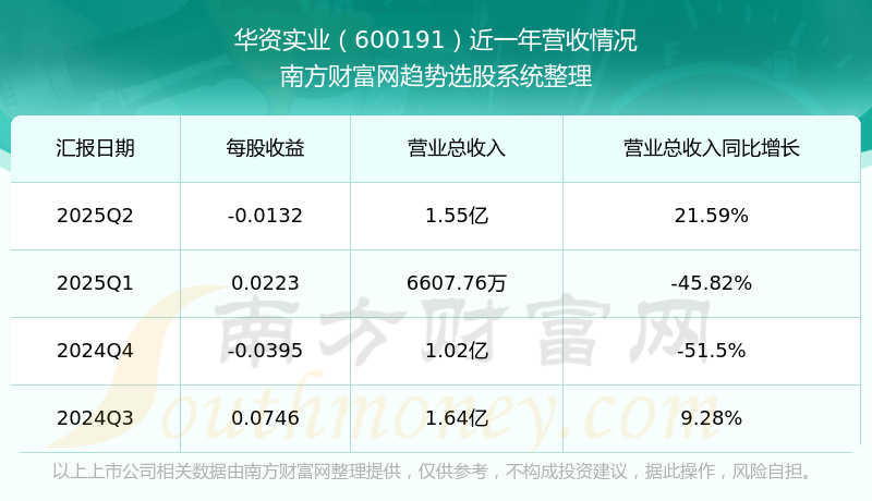 华资实业2025年第二季度公司实现营业收入1.55亿元,同比21.59%;归母净利润-641.32万元,同比-214.73%。