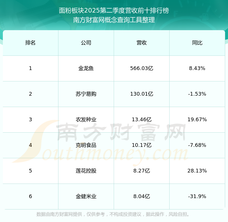 按照南方财富网概念查询工具统计,该股所属板块为面粉板块,该板块共有6只股票,华资实业2025第二季度营收在该板块中排名为第6名,该板块2025第二季度营收排名前十的股票如下表: