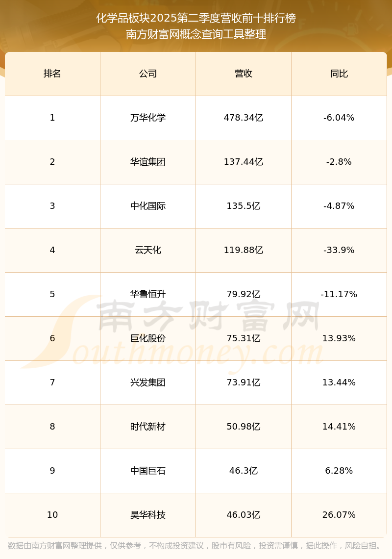 按照南方财富网概念查询工具统计,该股所属板块为化学品板块,该板块共有79只股票,康鹏科技2025第二季度营收在该板块中排名为第79名,该板块2025第二季度营收排名前十的股票如下表: