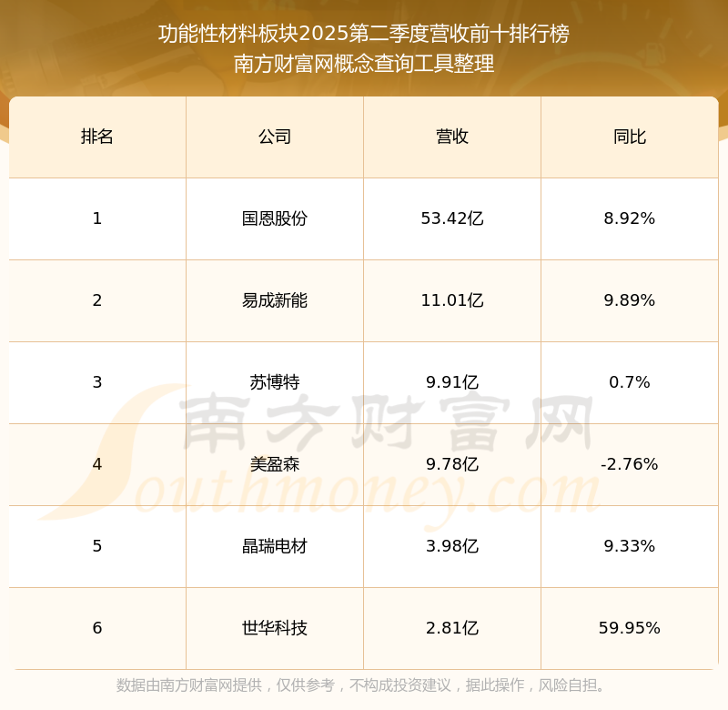 按照南方财富网概念查询工具统计,该股所属板块为功能性材料板块,该板块共有6只股票,世华科技2025第二季度营收在该板块中排名为第6名,该板块2025第二季度营收排名前十的股票如下表: