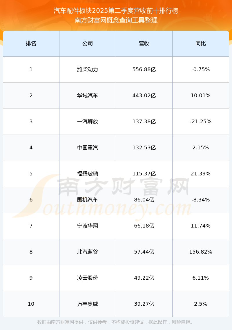 按照南方财富网概念查询工具统计,该股所属板块为汽车配件板块,该板块共有44只股票,嵘泰股份2025第二季度营收在该板块中排名为第44名,该板块2025第二季度营收排名前十的股票如下表: