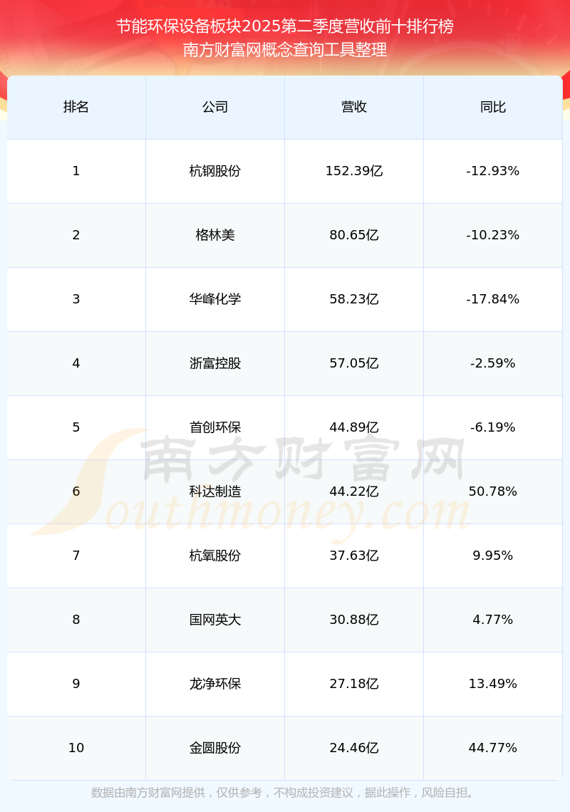 按照南方财富网概念查询工具统计,该股所属板块为节能环保设备板块,该板块共有51只股票,亚光股份2025第二季度营收在该板块中排名为第51名,该板块2025第二季度营收排名前十的股票如下表: