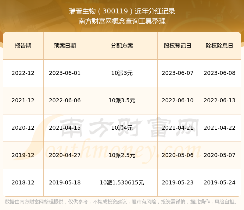 瑞普生物最新一次公布的分红方案为10派3元。本次权益分派股权登记日为2023年6月7日,除权除息日为2023年6月8日,派息日为2023年6月8日。