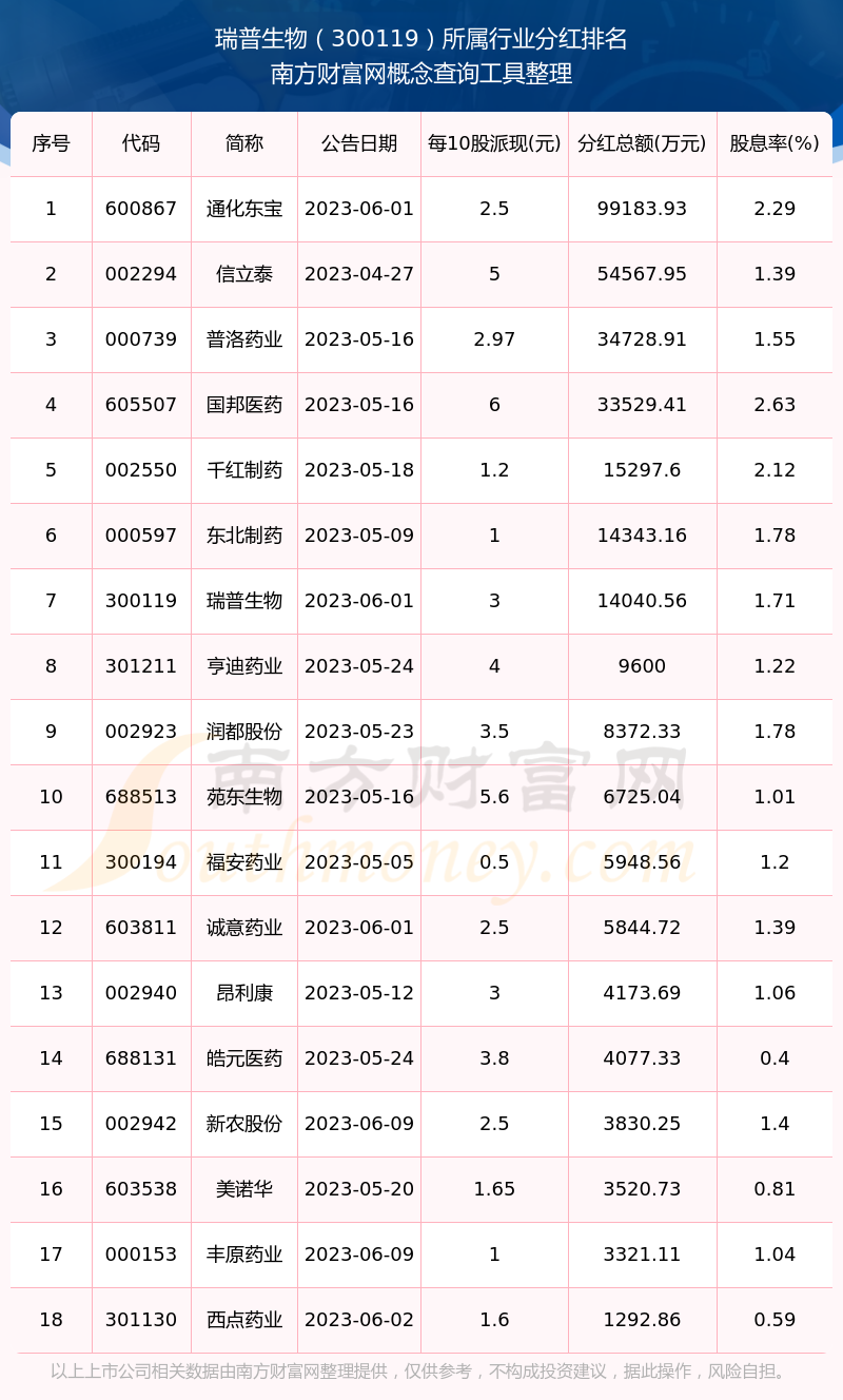 按照南方财富网趋势选股系统统计,瑞普生物所属行业为原料药行业,原料药行业分红排名情况如下表: