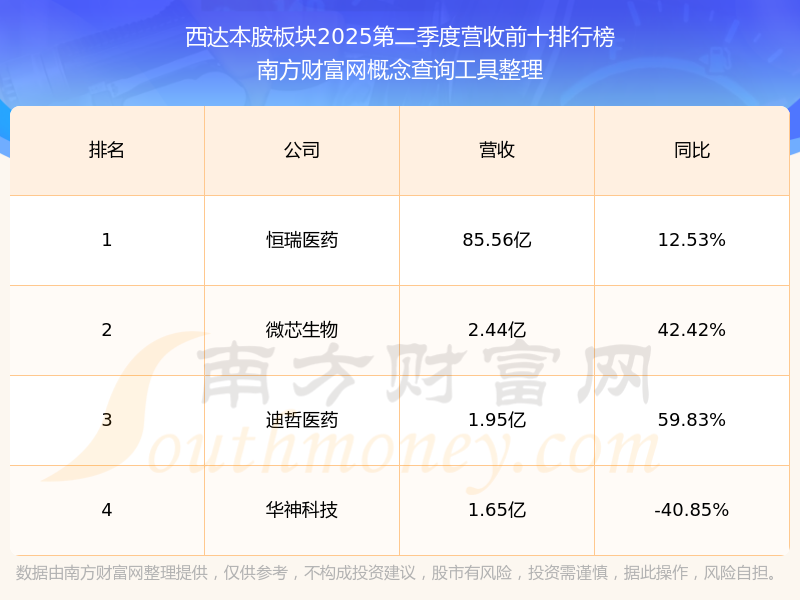 按照南方财富网概念查询工具统计,该股所属板块为西达本胺板块,该板块共有4只股票,微芯生物2025第二季度营收在该板块中排名为第2名,该板块2025第二季度营收排名前十的股票如下表: