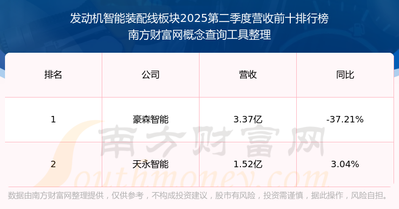 按照南方财富网概念查询工具统计,该股所属板块为发动机智能装配线板块,该板块共有2只股票,豪森智能2025第二季度营收在该板块中排名为第1名,该板块2025第二季度营收排名前十的股票如下表: