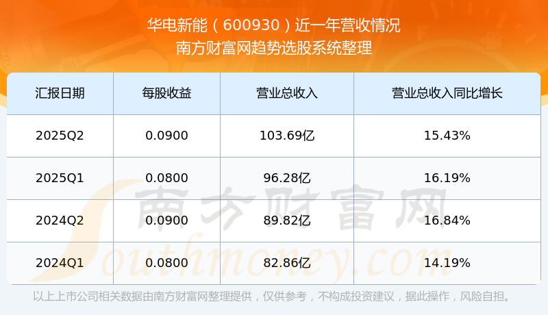 华电新能2025年第二季度显示,公司主营收入103.69亿元,同比15.43%;归母净利润33.18亿元,同比-4.18%;扣非净利润32.97亿元,同比-3.71%。