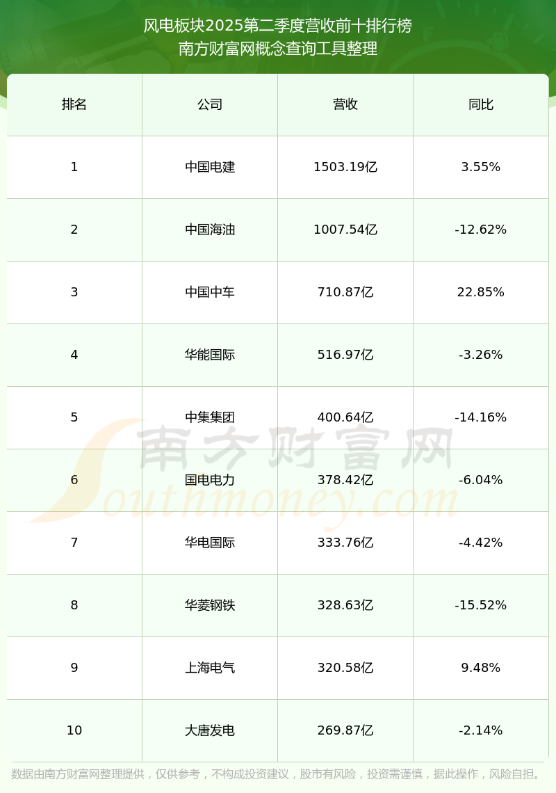 按照南方财富网概念查询工具统计,该股所属板块为风电板块,该板块共有287只股票,华电新能2025第二季度营收在该板块中排名为第30名,该板块2025第二季度营收排名前十的股票如下表: