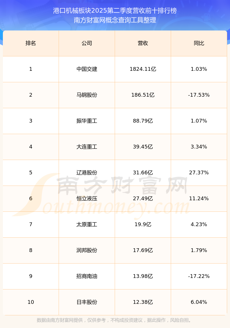 按照南方财富网概念查询工具统计,该股所属板块为港口机械板块,该板块共有15只股票,振华重工2025第二季度营收在该板块中排名为第3名,该板块2025第二季度营收排名前十的股票如下表: