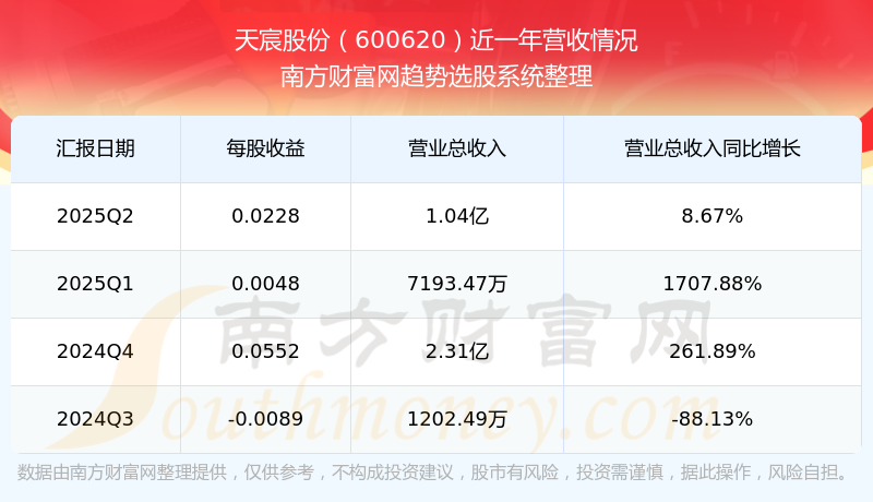 天宸股份(600620)披露2025年第二季度报告,报告期实现营收1.04亿元,同比8.67%;归母净利润1564万元,同比-30.24%;扣非净利润1341.67万元,同比828.46%;基本每股收益0.02元。