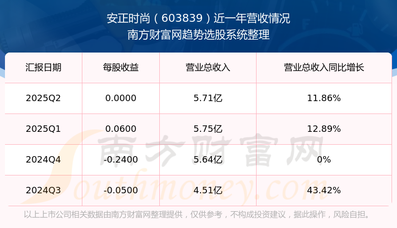安正时尚(603839)披露2025年第二季度报告,报告期实现营收5.71亿元,同比11.86%;归母净利润-96.61万元,同比-160.2%;扣非净利润-695.93万元,同比-1747.95%。