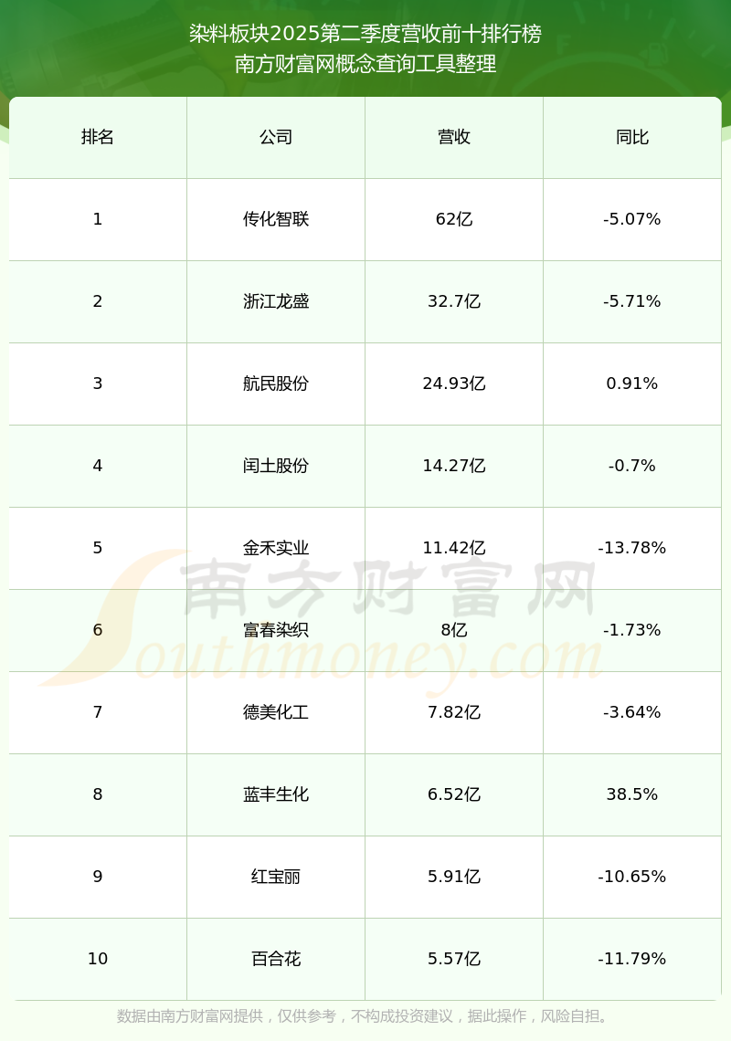 按照南方财富网概念查询工具统计,该股所属板块为染料板块,该板块共有32只股票,雅运股份2025第二季度营收在该板块中排名为第24名,该板块2025第二季度营收排名前十的股票如下表: