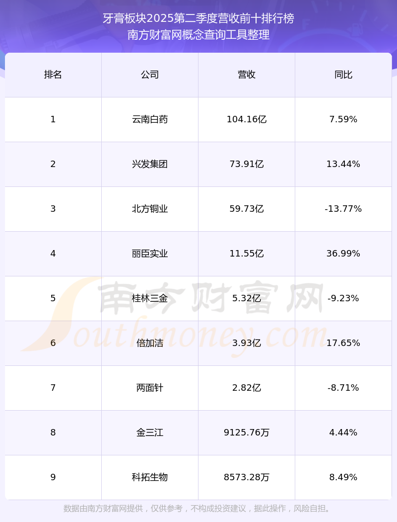 按照南方财富网概念查询工具统计,该股所属板块为牙膏板块,该板块共有9只股票,两面针2025第二季度营收在该板块中排名为第7名,该板块2025第二季度营收排名前十的股票如下表: