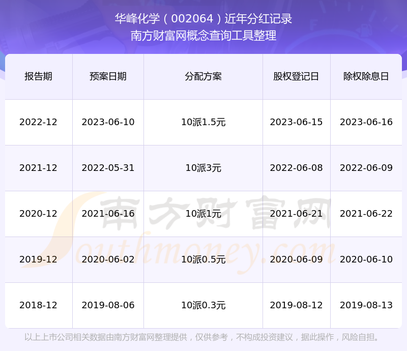 华峰化学最新一次公布的分红方案为10派1.5元。本次权益分派股权登记日为2023年6月15日,除权除息日为2023年6月16日,派息日为2023年6月16日。