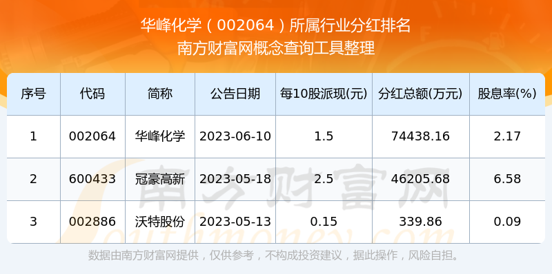 按照南方财富网趋势选股系统统计,华峰化学所属行业为化学纤维行业,化学纤维行业分红排名情况如下表:
