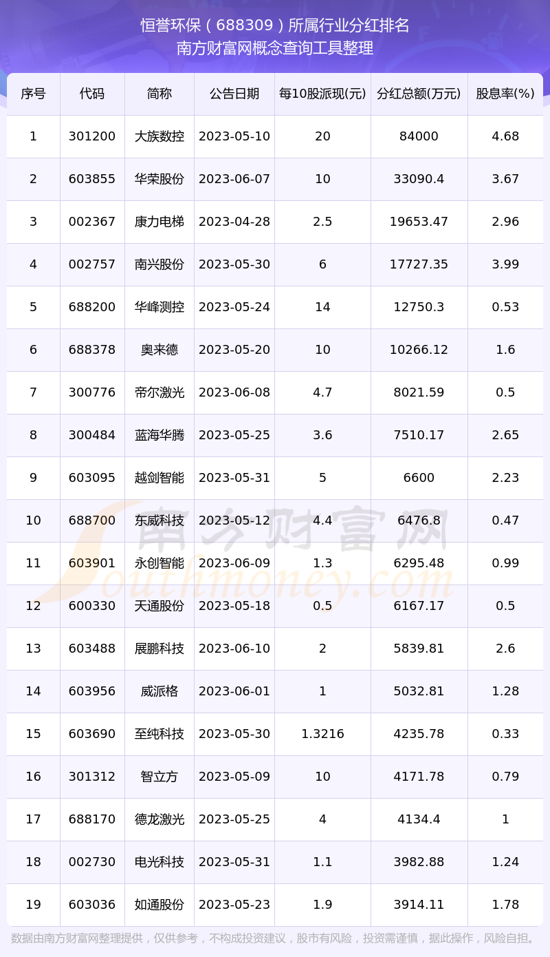 按照南方财富网趋势选股系统统计,恒誉环保所属行业为环保行业,环保行业分红排名情况如下表: