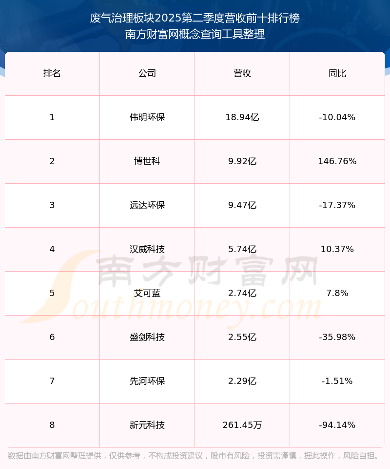 按照南方财富网概念查询工具统计,该股所属板块为废气治理板块,该板块共有8只股票,盛剑科技2025第二季度营收在该板块中排名为第6名,该板块2025第二季度营收排名前十的股票如下表: