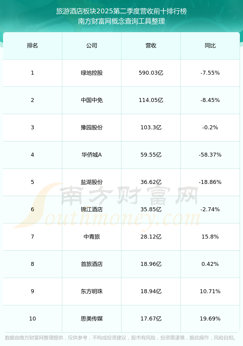 按照南方财富网概念查询工具统计,该股所属板块为旅游酒店板块,该板块共有69只股票,天目湖2025第二季度营收在该板块中排名为第50名,该板块2025第二季度营收排名前十的股票如下表: