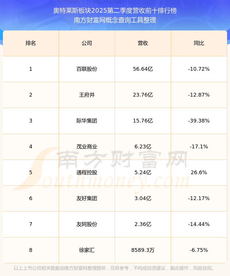 按照南方财富网概念查询工具统计,该股所属板块为奥特莱斯板块,该板块共有8只股票,王府井2025第二季度营收在该板块中排名为第2名,该板块2025第二季度营收排名前十的股票如下表: