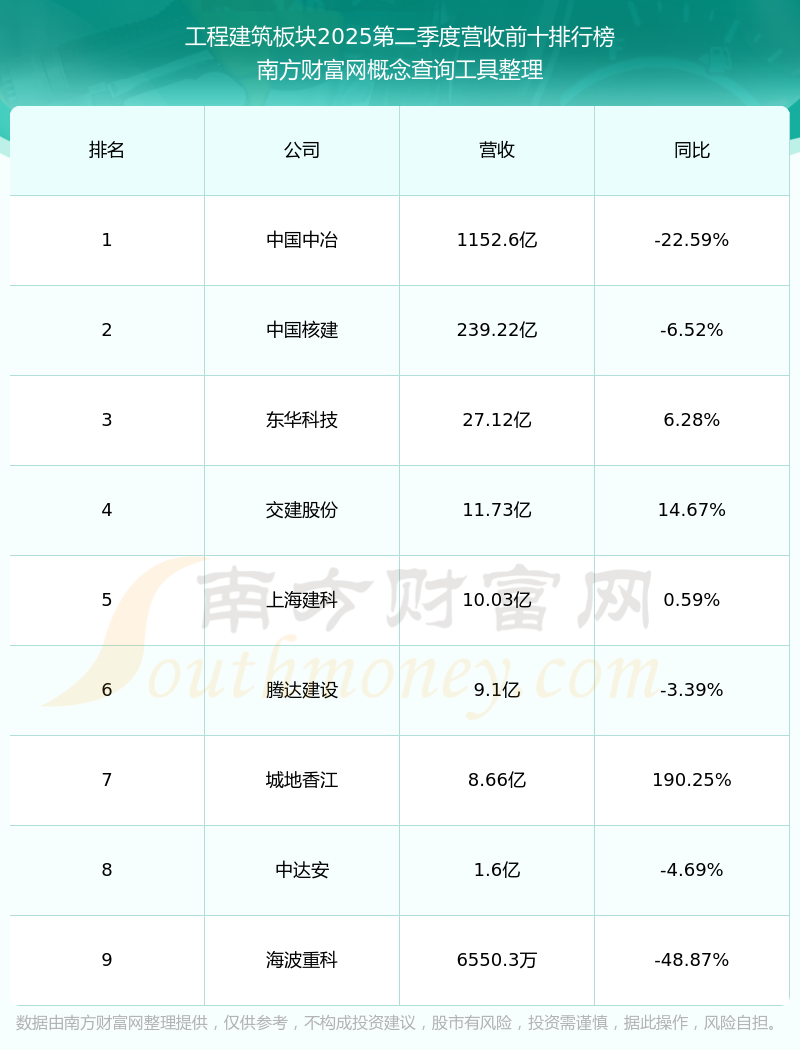 按照南方财富网概念查询工具统计,该股所属板块为工程建筑板块,该板块共有9只股票,中国中铁2025第二季度营收在该板块中排名为第9名,该板块2025第二季度营收排名前十的股票如下表: