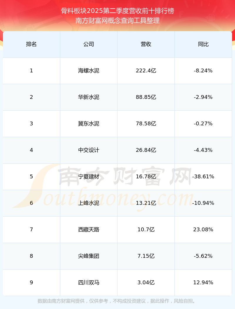 按照南方财富网概念查询工具统计,该股所属板块为骨料板块,该板块共有9只股票,海螺水泥2025第二季度营收在该板块中排名为第1名,该板块2025第二季度营收排名前十的股票如下表: