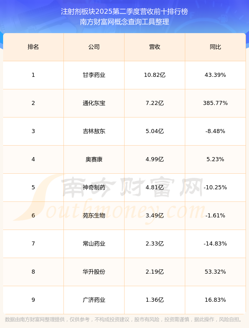 按照南方财富网概念查询工具统计,该股所属板块为注射剂板块,该板块共有9只股票,汇宇制药2025第二季度营收在该板块中排名为第9名,该板块2025第二季度营收排名前十的股票如下表:
