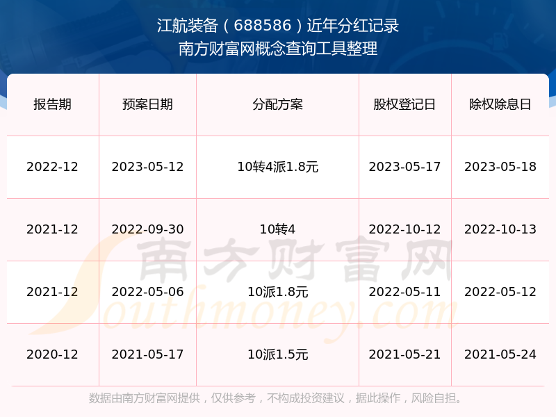 江航装备最新一次公布的分红方案为10转4派1.8元。本次权益分派股权登记日为2023年5月17日,除权除息日为2023年5月18日,派息日为2023年5月18日。