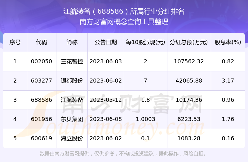 按照南方财富网趋势选股系统统计,江航装备所属行业为航空产品行业,航空产品行业分红排名情况如下表: