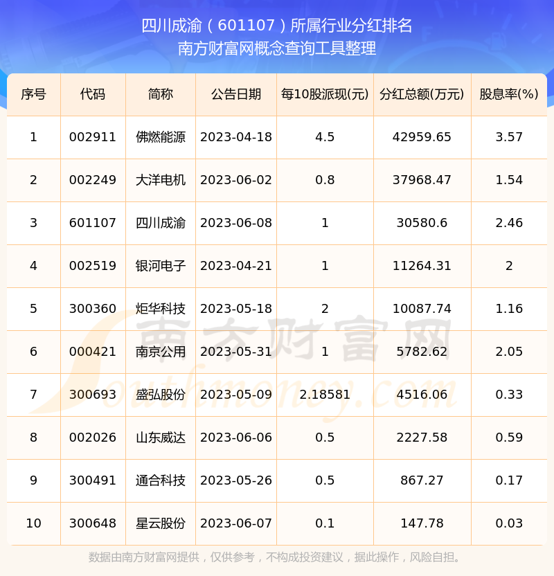 四川成渝最新一次公布的分红方案为10派1元。本次权益分派股权登记日为2023年6月14日,除权除息日为2023年6月15日,派息日为2023年6月15日。
