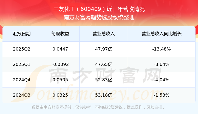 三友化工2025年第二季度报告显示,公司实现主营业务收入47.97亿元,较去年同期增长-13.48%;归属于母公司股东的净利润为9226.8万元,同比增长-63.05%;扣除非经常性损益后的净利润为7983.14万元,同比增长-68.23%。